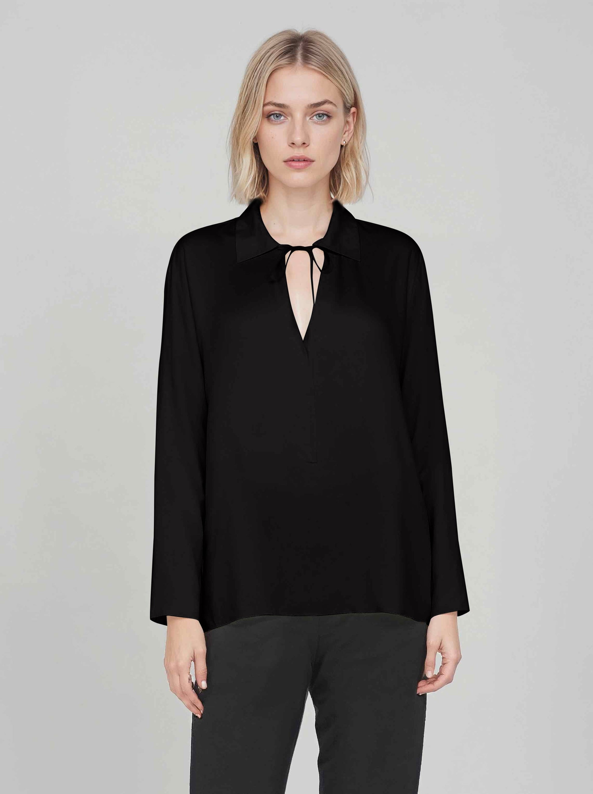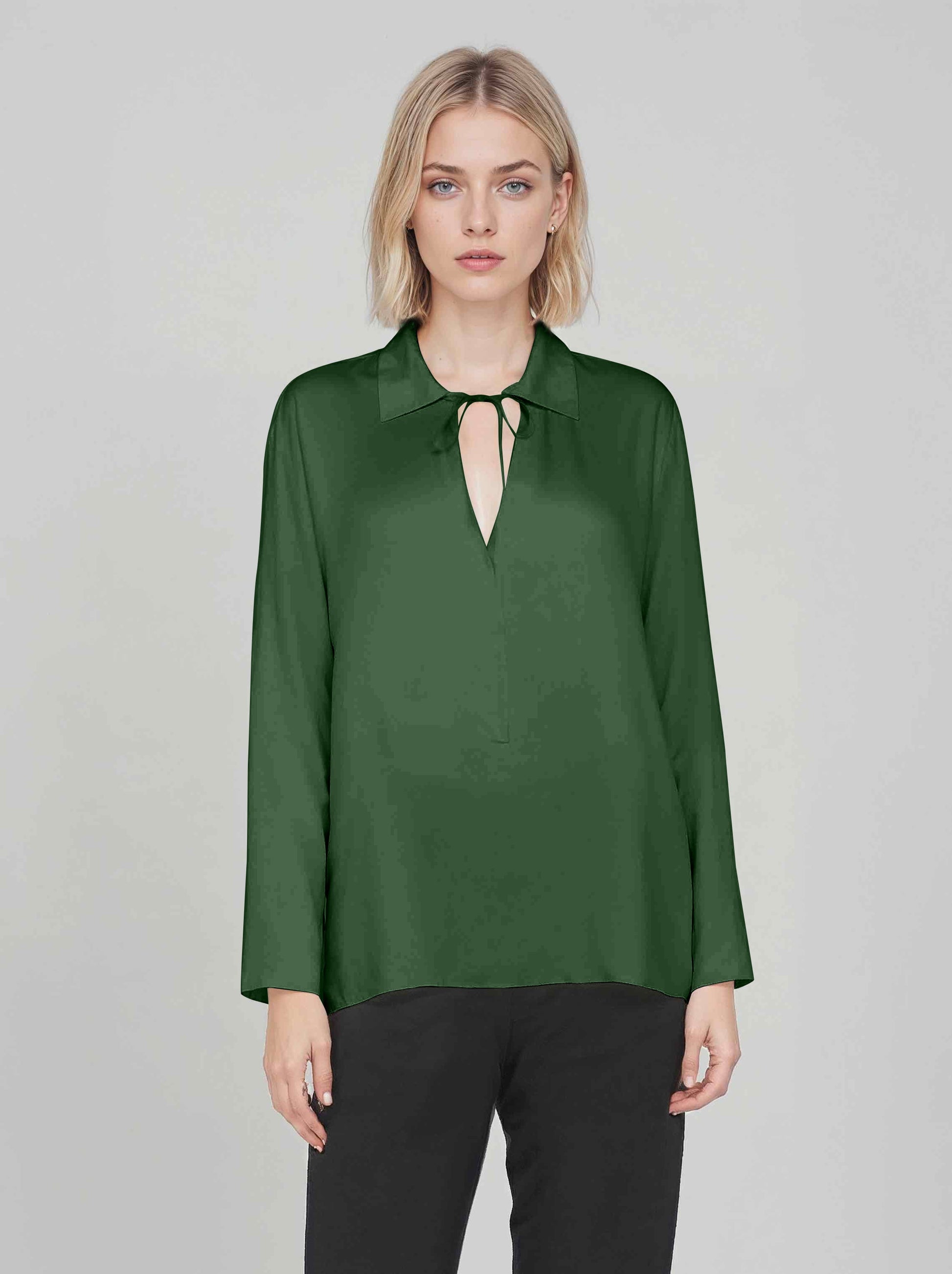 A sleek wardrobe staple, our Bettina Blouse fits in everywhere. made in our signature satin TENCEL and with a subtly relaxed shape, this versatile blouse is a perfect choice for any occasion. Featuring a polo collar and a tie a the neck. Long sleeves and hemline that hits at sleeve length.