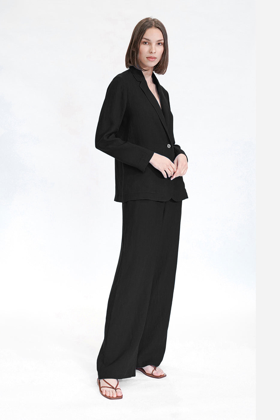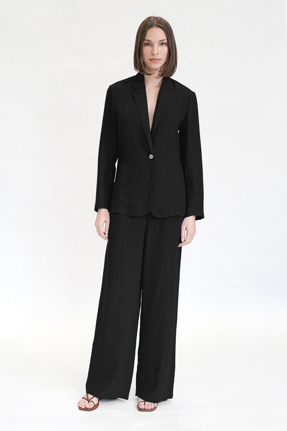 Made from luxurious 100% linen, this jacket is the epitome of breezy elegance, offering a lightweight and breathable feel that's perfect for any season. Its classic silhouette exudes versatility, seamlessly transitioning from casual to dressy occasions with ease. Shown with our Cara Palazzo Pants.