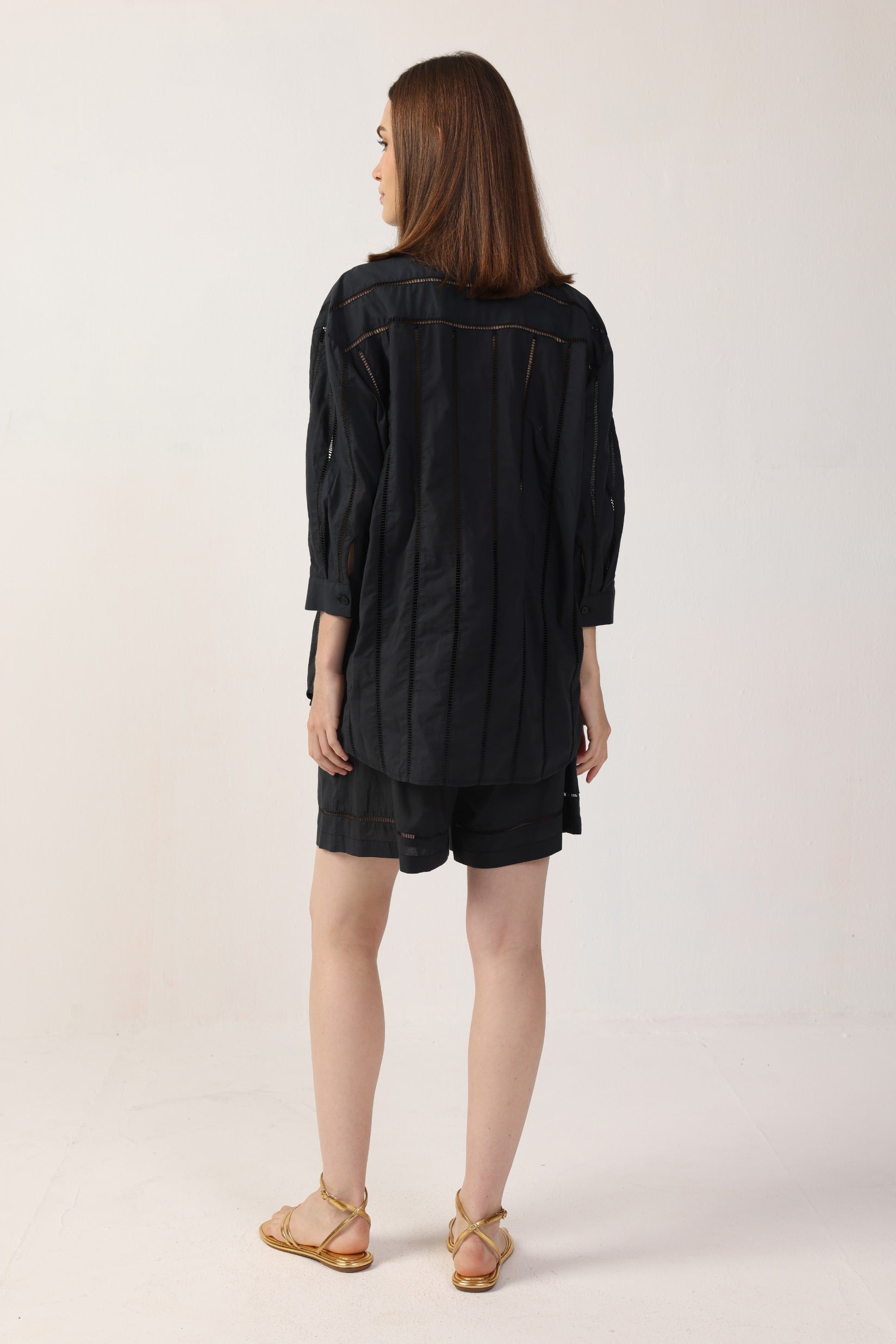 The Leah Blouse is crafted from premium cotton poplin fabric, offering a lightweight and breathable feel. Featuring intricate ladder lace details, this blouse combines elegance with a contemporary edge. It is designed with a relaxed fit, a classic collar, button-down front, and 3/4 sleeves, making it a versatile piece for both casual and formal settings.