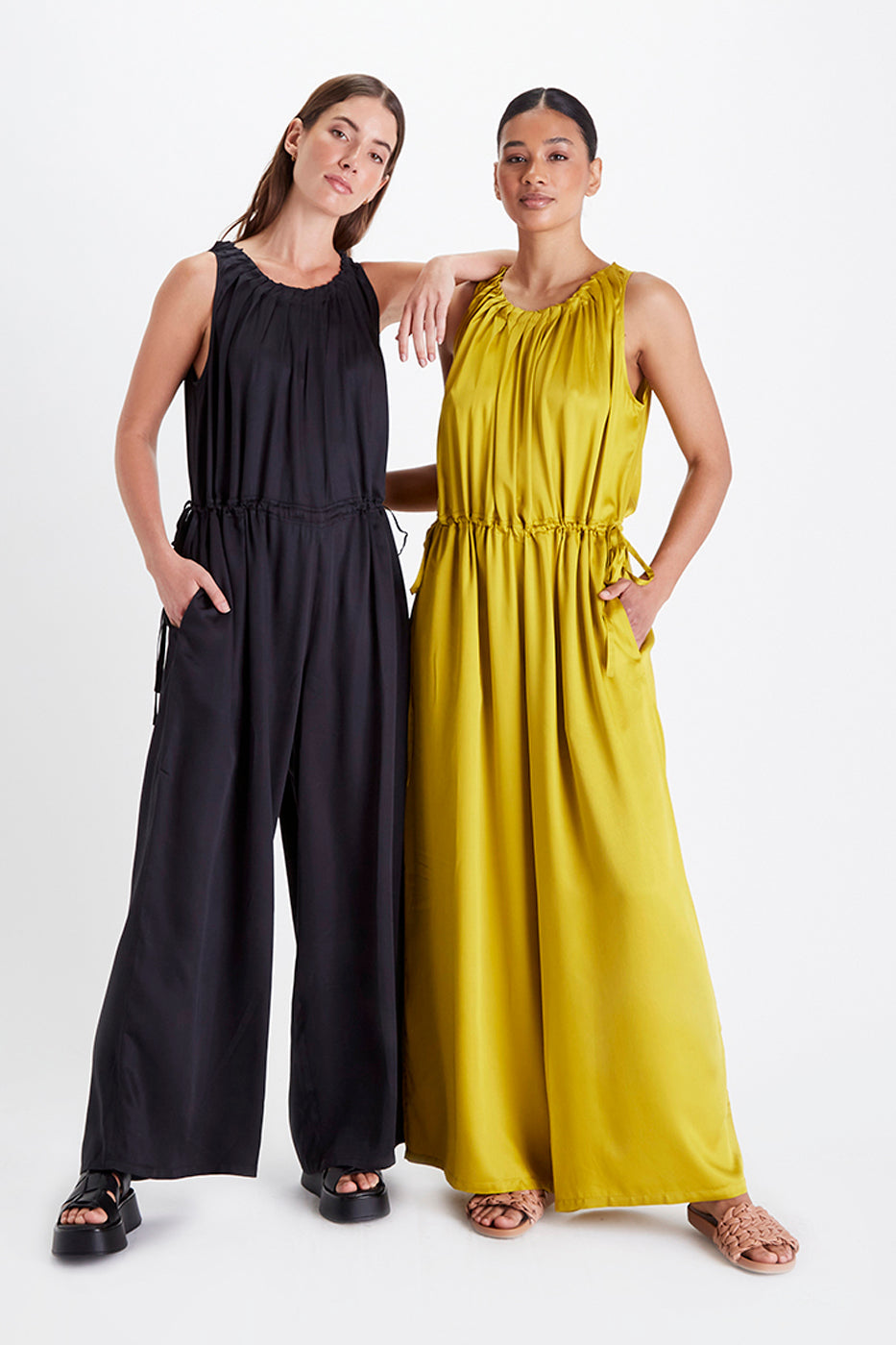 - Your three favorite words: stylish, soft, and sustainable. The Sia jumpsuit checks off everything on your list. The lavishly soft fabrication of natural Tencel fibers makes the fit an absolute dream. Designed to be relaxed but chic, this jumpsuit can be dressed up or down. Style with sandals for a casual look, or pair with your best heels and a bold lip for a night out. No zippers or buttons, just step in and tie at the back neck and you're ready to go.